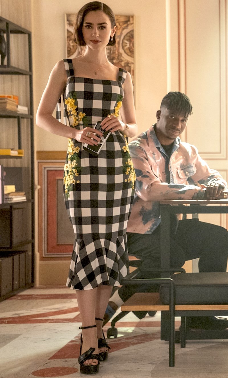 Das D&G Karo-Blumen-Midikleid (Folge 4). Das ist Emily pur. Ein Dolce & Gabbana Kleid, das Karo mit Blumendruck mischt, auf eine Art, die eigentlich verboten sein sollte, aber als "selbstbewusste Frau beim römischen Abendessen" funktioniert.