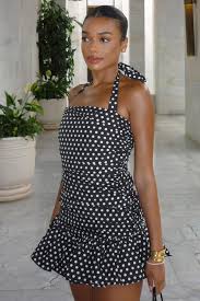 La robe bustier à pois a renvoyé de bonnes options pour la silhouette. L'original de Nina Ricci est une pièce de défilé, mais la silhouette froncée bustier est ce qui fait que ça marche comme robe de sortie, et c'est très trouvable à des prix abordables. Les pois sont une touche Fitoussi qu'on peut ajouter avec des accessoires.