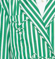 Le blazer vert rayé (Épisode 1). Emily débarque à Rome en veste Sebline verte brodée à rayures avec chemise à volants assortie et shorts Claudie Pierlot. C'est du chaos coordonné ; chaque pièce a sa propre énergie de motif mais elles partagent une famille de couleurs qui maintient l'ensemble.